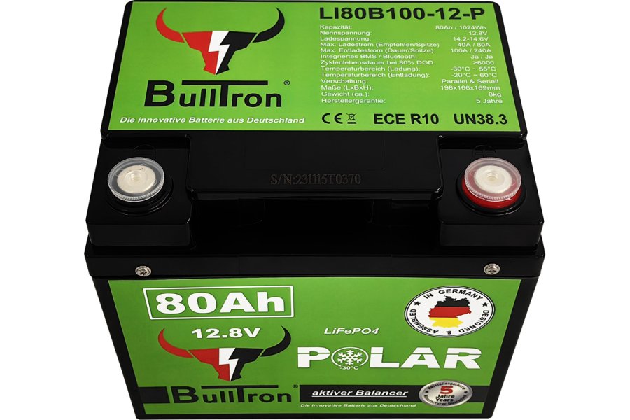De 12V 80Ah Polar LiFePO4 lithium accu van BullTron is een volwaardige vervanging voor 12V loodzuur-, AGM- en GEL-accu’s en maakt gebruik van veilige lithium-ijzerfosfaattechnologie (LiFePO4). Deze accu is ontworpen voor kleine campers en VW-busjes met beperkte inbouwruimte en een gemiddeld stroomverbruik.